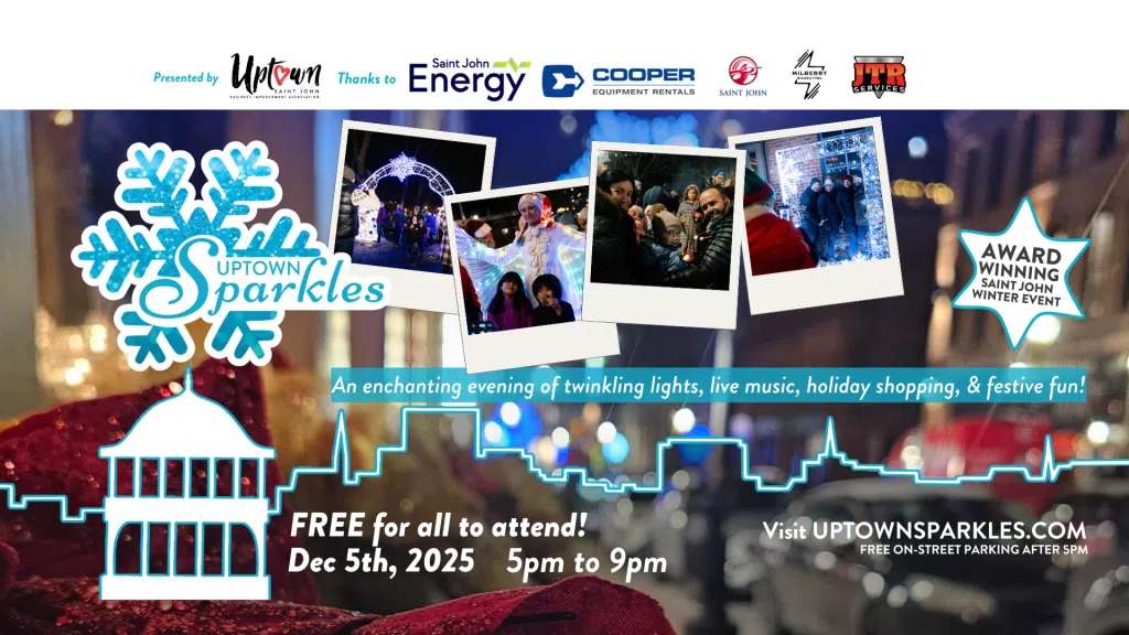 Uptown Sparkles is organized by Uptown Saint John Business Improvement Association, a not‑for‑profit that serves over 500 member businesses. Events like this are only possible because of the generous support of our sponsors. Special thanks to Saint John Energy, Cooper Equipment Rentals, The City of Saint John, JTR Services, Hall Brothers Enterprises, Kubota Canada, Fundy Harbour Group and our media sponsors: Milberry Marketing, 97.3 The Wave, CHSJ Country 94.1 FM and K100, for keeping the magic glowing. We are also grateful to our fire, ambulance and public works teams, whose hard work keeps Uptown Saint John safe and welcoming.